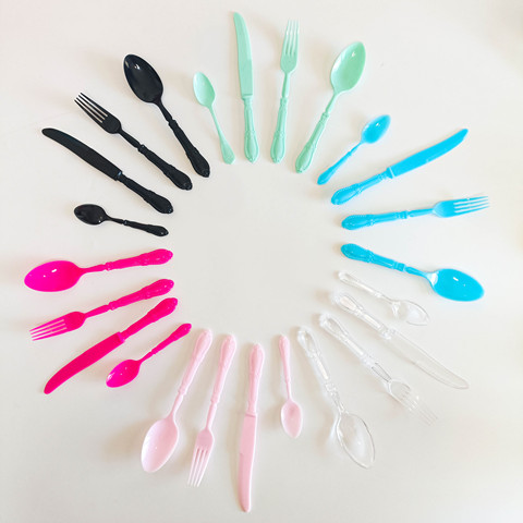 Commercio all'ingrosso di fabbrica 20cm di plastica coltello forchetta cucchiaio Set di tovaglioli nero rosa rosa menta posate Organizer plastica posate da cucina